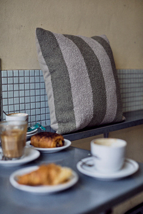 The cushion measures 50x50 cm. It is reversible, giving you two cushions in one. One side has jacquard-woven stripes of boucle yarn in olive and off-white. The other side has a sober beige fabric with a woven texture. Double Dazzling, indeed👌🏻. Hidden zipper at the bottom. Outdoor inner cushion included. Each cushion is sewn to order in our studio in Gothenburg. Exclusive to you via Preorder. 14-day return policy